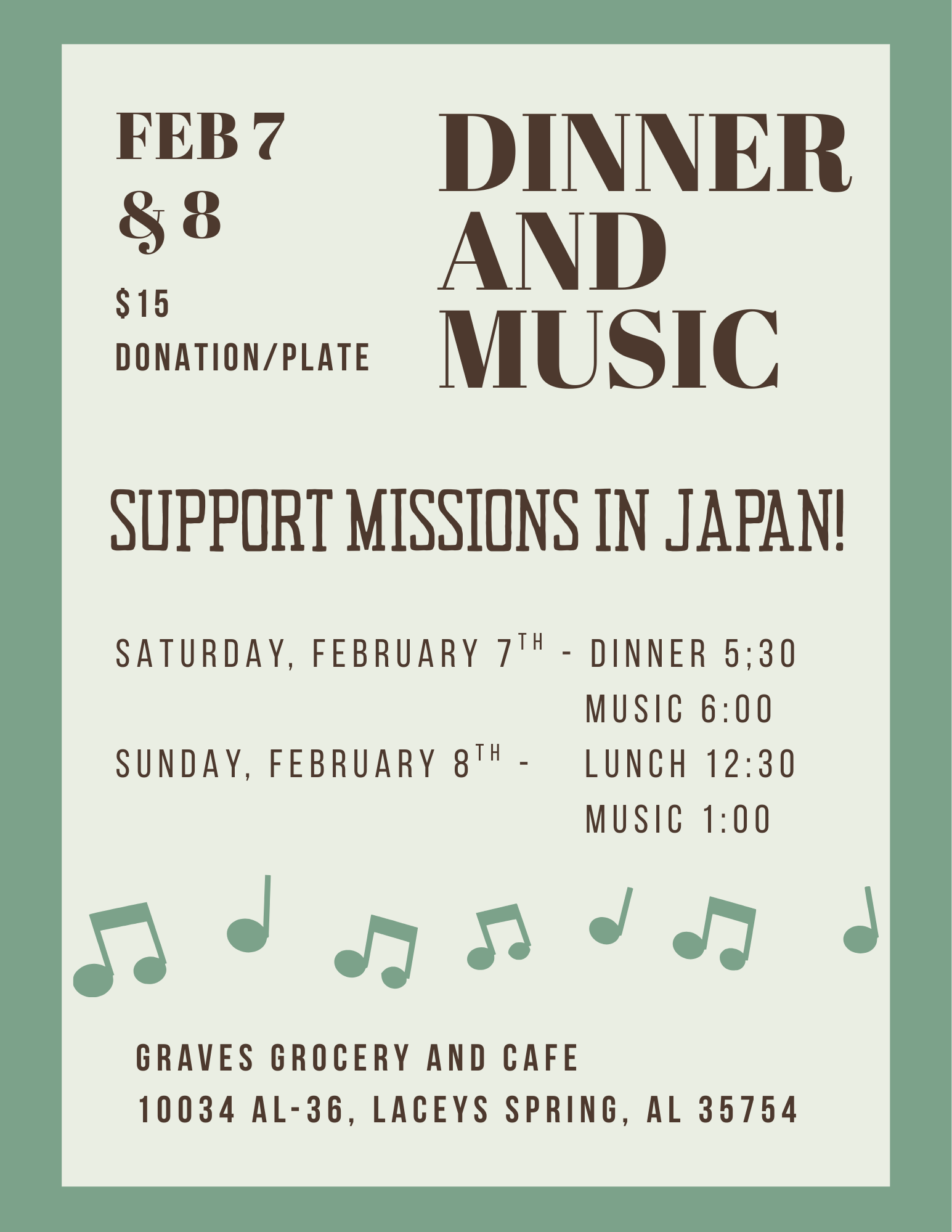 Dinner and a concert at Graves Grocery and Cafe. Proceeds go to support mission work in Nagoya, Japan. Dinner served at 5:30 pm, music starts at 6 pm.